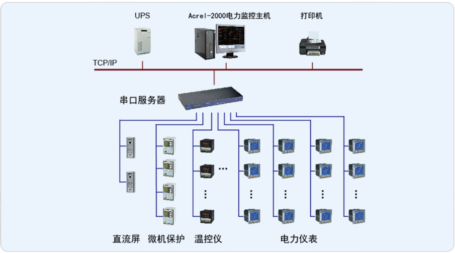 安科瑞對(duì)項(xiàng)目中10kV重要配電回路的多功能電表以及直流屏、溫控儀、光伏縱差保護(hù)裝置、小電流接地選線裝置等,采用現(xiàn)場(chǎng)總線組網(wǎng)方式,將采集數(shù)據(jù)傳至Acrel-2000電力監(jiān)控系統(tǒng),通過(guò)該系統(tǒng)實(shí)現(xiàn)變電所配電回路的配電監(jiān)測(cè)。