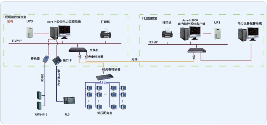 飛浦電子技術(shù)(上海)有限公司動(dòng)力房設(shè)備報(bào)警系統(tǒng),是在現(xiàn)有報(bào)警系統(tǒng)的基礎(chǔ)上進(jìn)行的智能化改造項(xiàng)目。原有系統(tǒng)基于西門子PLC采集現(xiàn)場(chǎng)各種傳感器變位或報(bào)警信號(hào),再通過聲、光形式輸出報(bào)警信號(hào)。為了便于管理和維護(hù),將動(dòng)力房設(shè)備報(bào)警系統(tǒng)PLC數(shù)據(jù)以及部分未接入PLC的報(bào)警開關(guān)量通過安科瑞ARTU裝置采集至現(xiàn)有的安科瑞Acrel-2000電力監(jiān)控系統(tǒng);在門衛(wèi)監(jiān)控室增加兩臺(tái)監(jiān)控計(jì)算機(jī),一臺(tái)作為安科瑞Acrel-2000電力監(jiān)控系統(tǒng)客戶端,另一臺(tái)整合了動(dòng)力房設(shè)備報(bào)警系統(tǒng)遠(yuǎn)程訪問客戶端;原監(jiān)控值班室和門衛(wèi)值班室之間通過光纖組建局域網(wǎng),實(shí)現(xiàn)系統(tǒng)遠(yuǎn)程監(jiān)控。